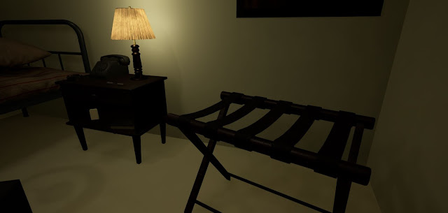 For this week my tasks were to listen to remaining audio in VR and complete the Rack game res / UVs and textures. I was able to achieve an old hotel vibe with the Rack, making sure to have dust, wear and making the wood look more aged because people have been putting their suitcases and items on it for a long time, plus it gets beat up occasionally when the underpaid cleaning staff fold it up and through it in the closet so they can vacuum under it. Overall I think it hits the mark for our purposes and with how it came out, it will be a visible hero asset near the door which is a primary focal point of our scene: